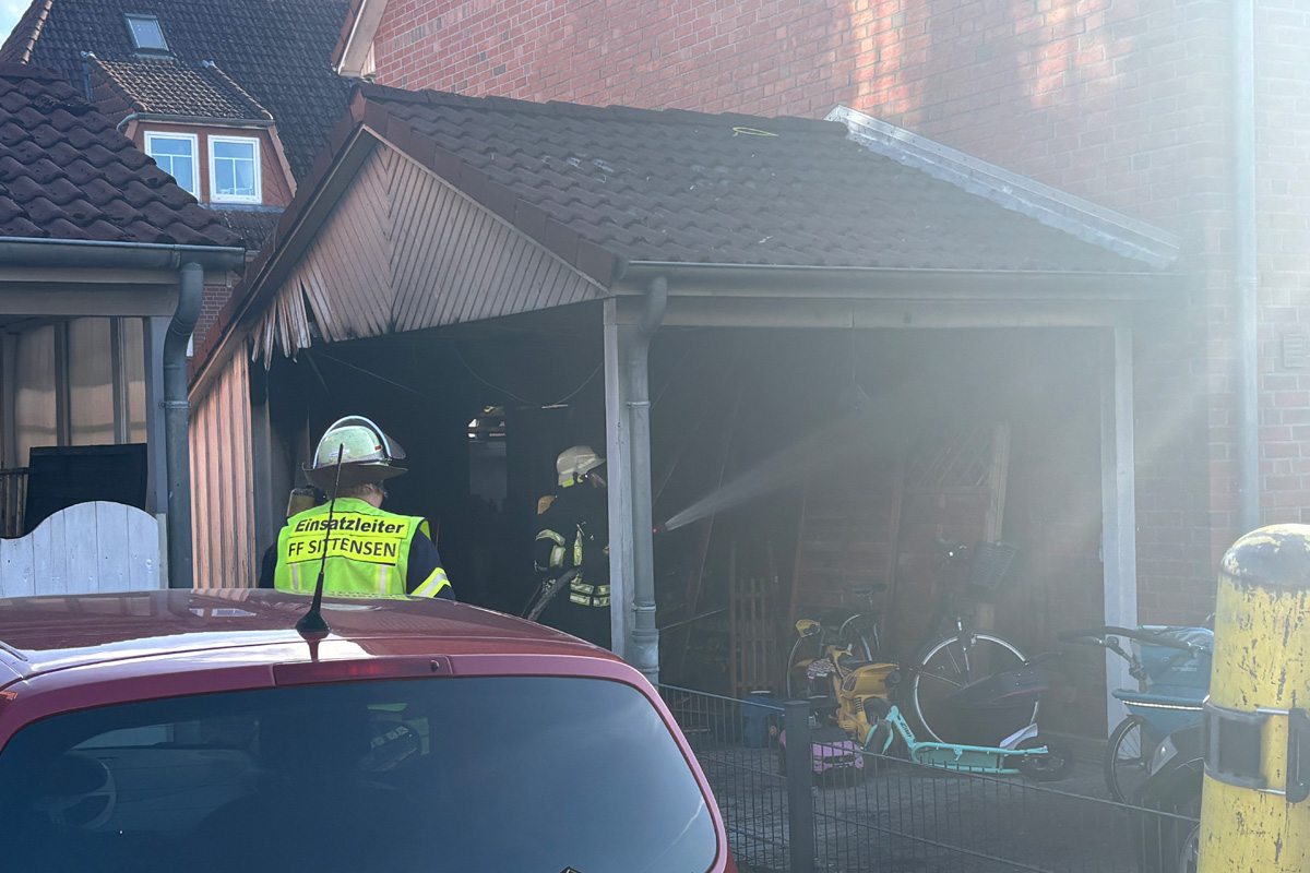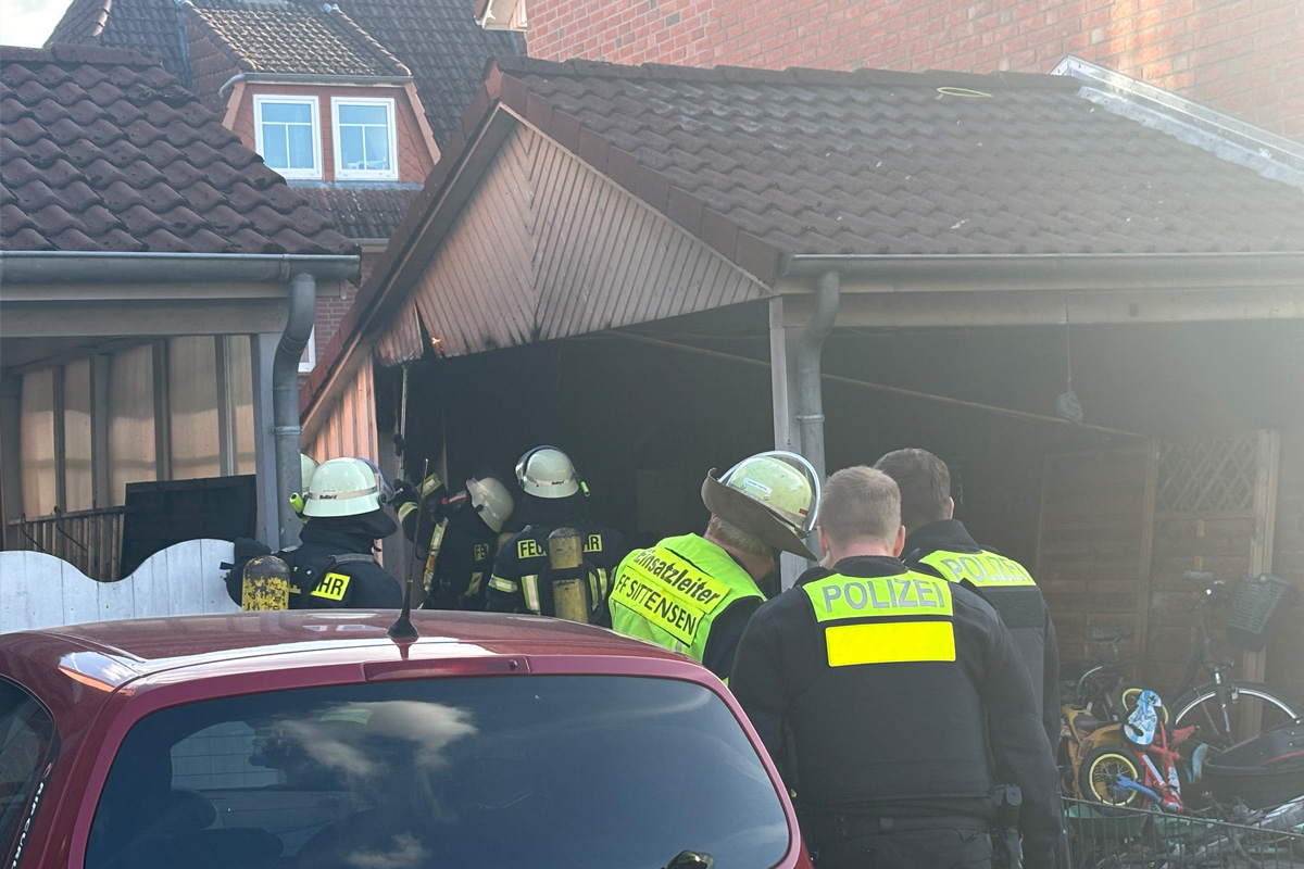 Bei einem Brand in Sittensen (NI) ist am Ostermontag, 05.04.2026, ein Carport in Flammen aufgegangen. Das Feuer griff auf einen Geräteschuppen über, konnte jedoch rechtzeitig gestoppt werden. Zwei Personen wurden behandelt und in ein Krankenhaus gebracht.
