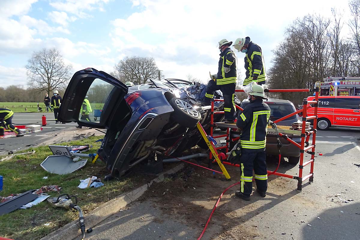 Freitag, 26.03.2021, 15:51 Uhr - Ein schwerer Verkehrsunfall ereignete sich am Freitagnachmittag an der Kreuzung aus Balberger Straße und Uedemerbrucher Straße. Dabei wurden eine Person schwer und zwei Personen leicht verletzt. Die schwer verletzte Person war in ihrem Fahrzeug eingeschlossen und musste von der Feuerwehr befreit werden.