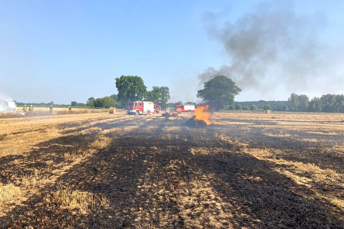 Neben der brennenden Presse standen an fünf Stellen Rundballen in Flammen, zudem brannte das Stoppelfeld auf einer Fläche von etwa 2.000 m². Bei trockener Witterung verhinderten die Einsatzkräfte zunächst eine weitere Ausbreitung des Feuers.
