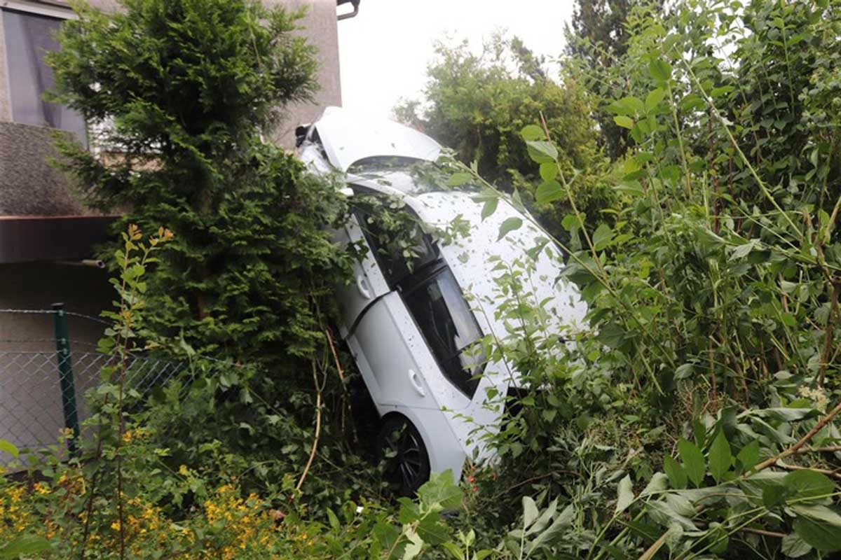 Gegen 6.50 Uhr verlor sie dabei aus noch ungeklärten Gründen die Kontrolle über ihren Wagen und fuhr in einer scharfen Rechtskurve gerade aus über eine Böschung. Hierdurch wurde der Skoda in die Luft katapultiert und flog gegen ein Fenster im ersten Obergeschoss eines Mehrfamilienhauses. Danach rutschte der Pkw mit der Front auf dem direkt angrenzenden Balkon des 1.OG und landete mit dem Heck in das Gebüsch darunter.