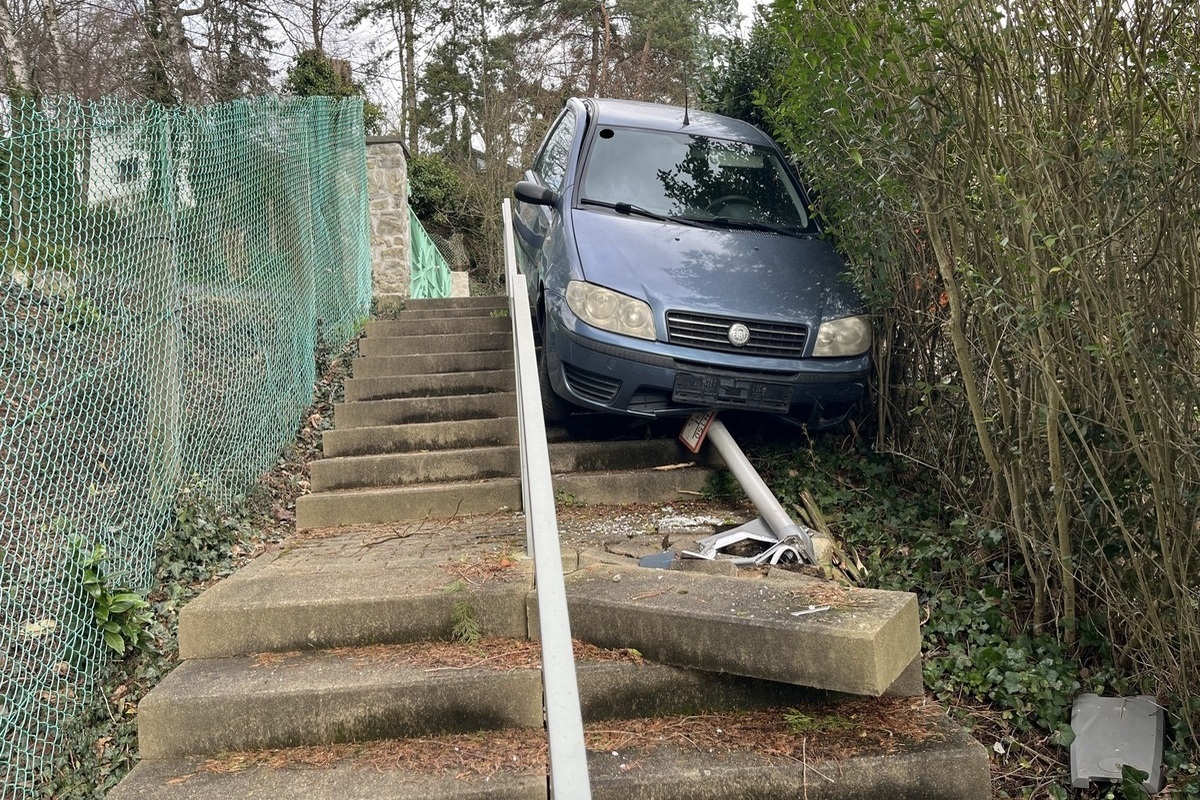 Danach flüchtet der Fahrer in unbekannte Richtung. Durch den Unfall wird auch die Treppe beschädigt. Der Gesamtschaden wird auf mehrere tausend Euro geschätzt.