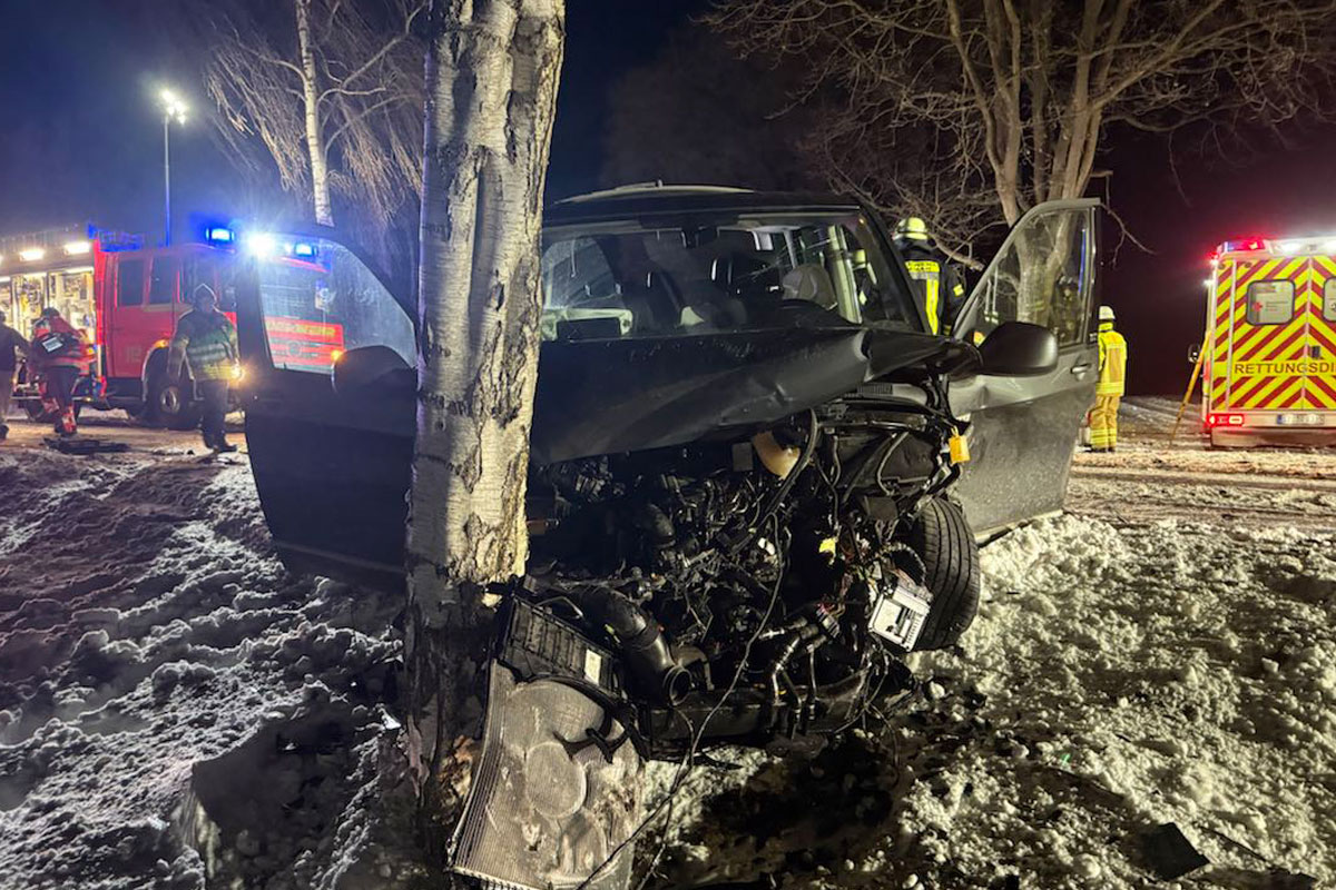 Der VW Bus wurde durch den Aufprall gegen einen Baum geschleudert. (Bildquelle: Polizeiinspektion Stade)