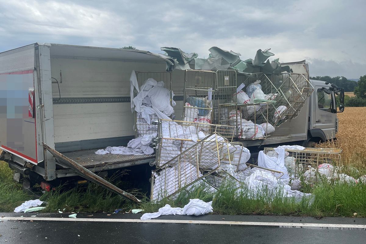 Anschließend schleuderte der Lkw über die Fahrbahn, kam im angrenzenden Feld zum Stehen und wurde dabei an der Seite aufgerissen. Teile der geladenen Wäsche verstreuten sich auf der Fahrbahn.