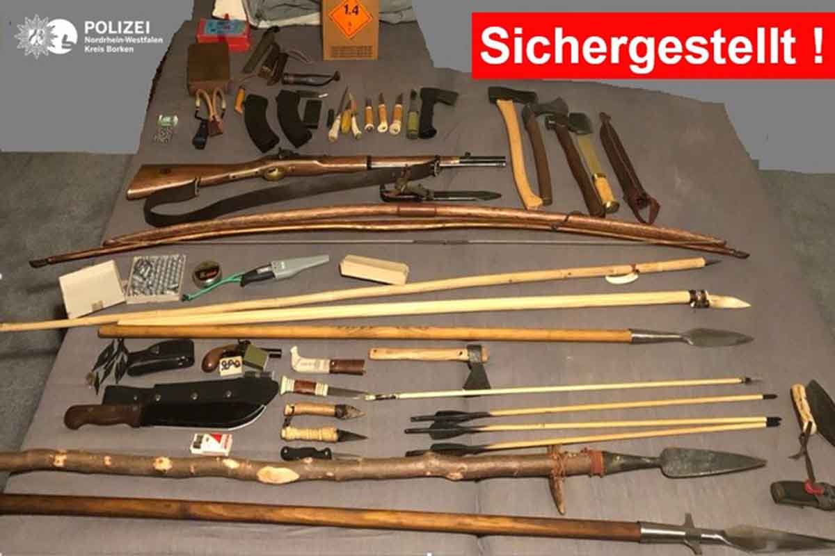 Sichergestellt wurden: Ein Vorderlader, fünf Speere, Schwarzpulver, mehrere Magazine für Schusswaffen, diverse Munition, Pfeilspitzen, fünf Äxte, 19 Messer (keine Haushaltsmesser), eine "Zwille", zwei Bögen und Pfeile.