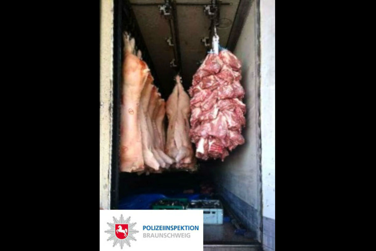 Doch es waren nicht nur rein technische Probleme, mit denen die Polizei den Lkw-Fahrer konfrontieren musste. Seine Ladung entsprach nicht den Hygienevorschriften für Lebensmittel. Schweinehälften und frisches Fleisch hingen von der Decke und berührten teilweise die Bordwand. Ebenso waren Teile des Frischfleisches vom Haken auf den Ladeboden gefallen, welcher lediglich mit blauen Müllsäcken ausgelegt war. Beim Öffnen der Portaltüren tropfte Flüssigkeit von der Ladefläche.