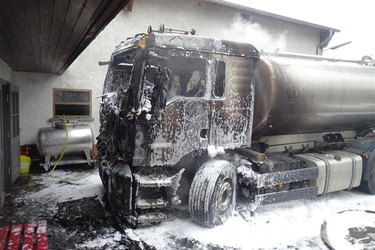 Der Milchtanklastwagen wird hierbei stark beschädigt. Der Lastkraftwagen war zum Befüllen neben einem Anwesen abgestellt. Das Anwesen wird durch das Feuer nur leicht an der Fassade beschädigt.
