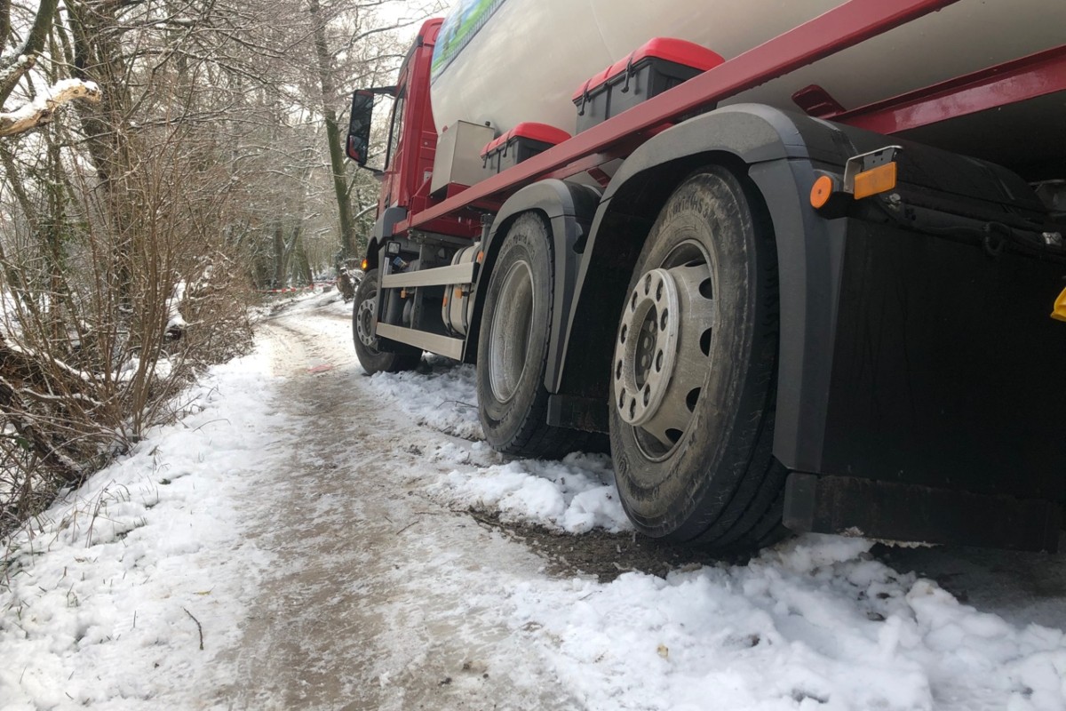 Ein mit 20.000 Liter Propangas beladener Tanklaster ist heute morgen an der Siebeneicker Straße beim Rangieren auf der schneebedeckten Zufahrt zu einem Bauernhof von der Fahrbahn gerutscht und erheblich in Schieflage geraten.