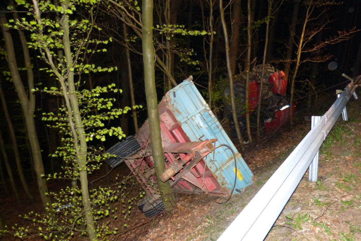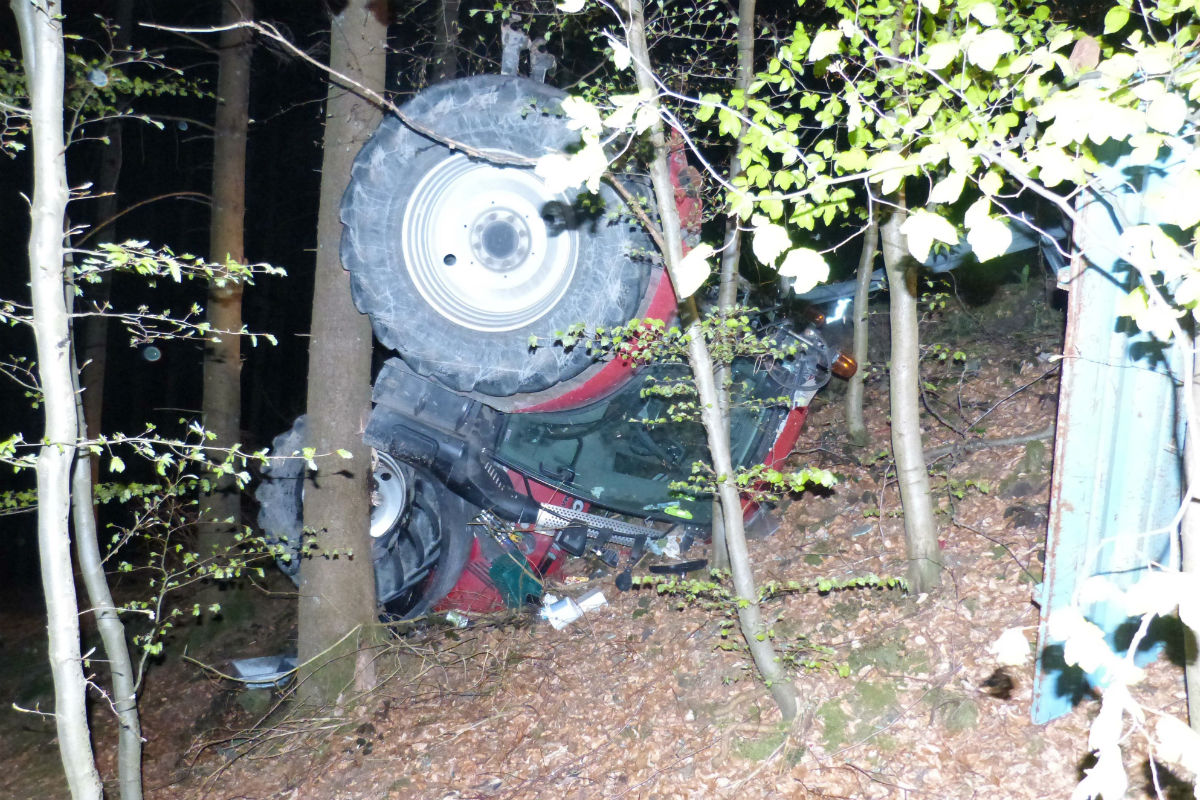 Ein Traktor samt Anhänger verunglückte am Samstagmorgen gegen 01.20 Uhr auf der Homertstraße in Gummersbach-Lieberhausen. Der unter Alkohol stehende, 28-jährige Traktorfahrer aus Gummersbach hatte in einer abschüssigen Linkskurve die Kontrolle über sein Gefährt verloren und war von der Fahrbahn abgekommen. Der Traktor durchbrach eine Leitplanke, überschlug sich und stürzte einen Abhang hinunter. Wie durch ein Wunder zog sich der 28-Jährige lediglich leichte Verletzungen zu. Da er aber stark unter Alkoholeinwirkung stand, musste er neben einer Blutprobe auch seinen Führerschein abgeben. Die Bergung von Taktor und Anhänger gestaltete sich schwierig, da der Traktor kopfüber zwischen Bäumen lag; ein Kranunternehmen musste mit der Bergung beauftragt werden.
