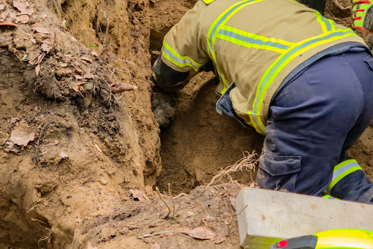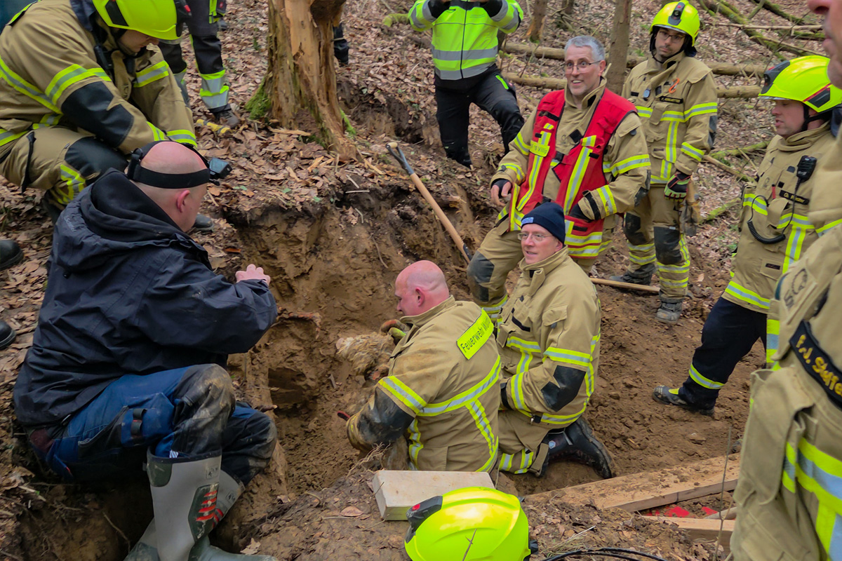 Die Feuerwehr öffnete daraufhin vorsichtig den entsprechenden Gang und arbeitete sich zu dem Tier vor. Dabei stellte sich heraus, dass sich die Leine des Hundes im Bau verfangen hatte und er sich deshalb nicht selbst befreien konnte.