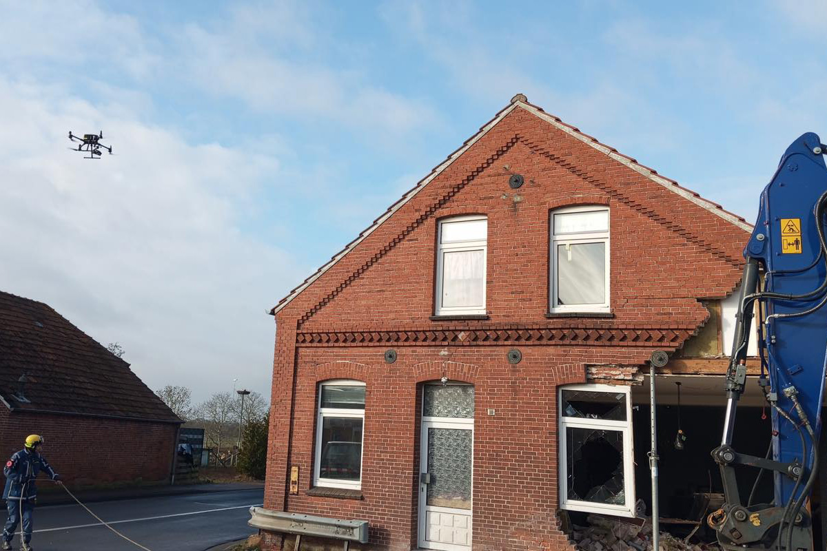 Auch eine Drohne war zur Erkundung der Gebäudesicherheit im Einsatz. (Bildquelle: Freiwillige Feuerwehren der Stadt Weener-Ems)