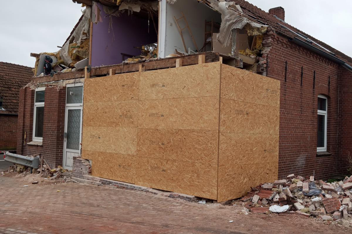 Die zerstörte Wand wurde vom THW abgesichert. (Bildquelle: Freiwillige Feuerwehren der Stadt Weener-Ems)