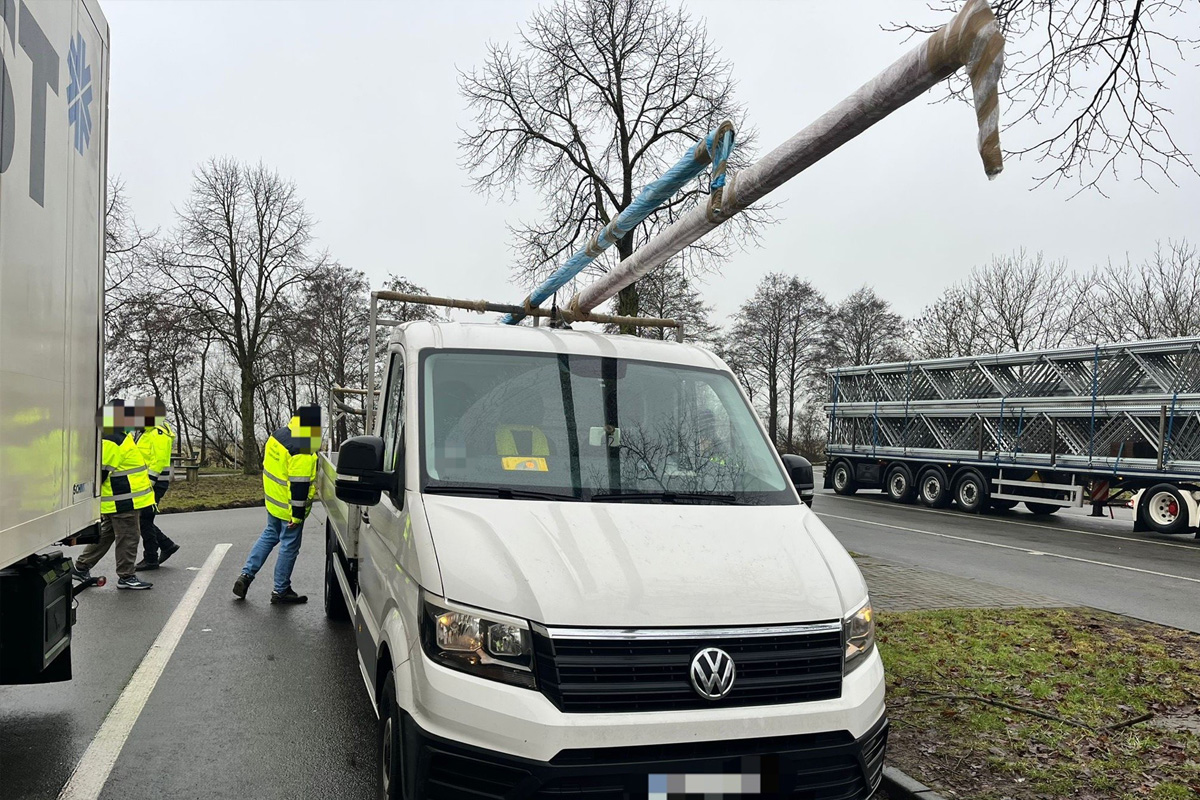 Bis auf zwei Spanngurte standen dem Fahrzeugführer keine geeigneten Sicherungsmittel zur Verfügung. Darüber hinaus wies die Ladung einen unzulässigen Überhang auf.