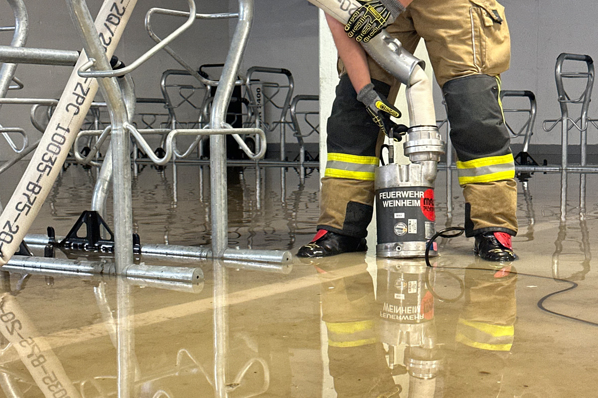 Mit Pumpen und Saugern wurden die Überflutungen beseitigt. (Bildquelle: Feuerwehr Weinheim)