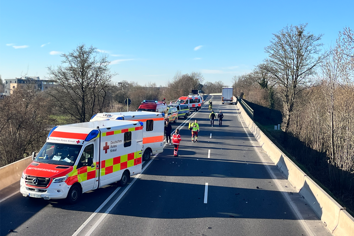 Am 02.03.2026 gegen 08:15 Uhr kam es auf der B38 Westtangente bei Weinheim (BW) zu einem schweren Verkehrsunfall mit vier beteiligten Fahrzeugen. Zwei Personen wurden schwer, drei weitere leicht bis mittelschwer verletzt. Die Bundesstraße war in beide Richtungen voll gesperrt.