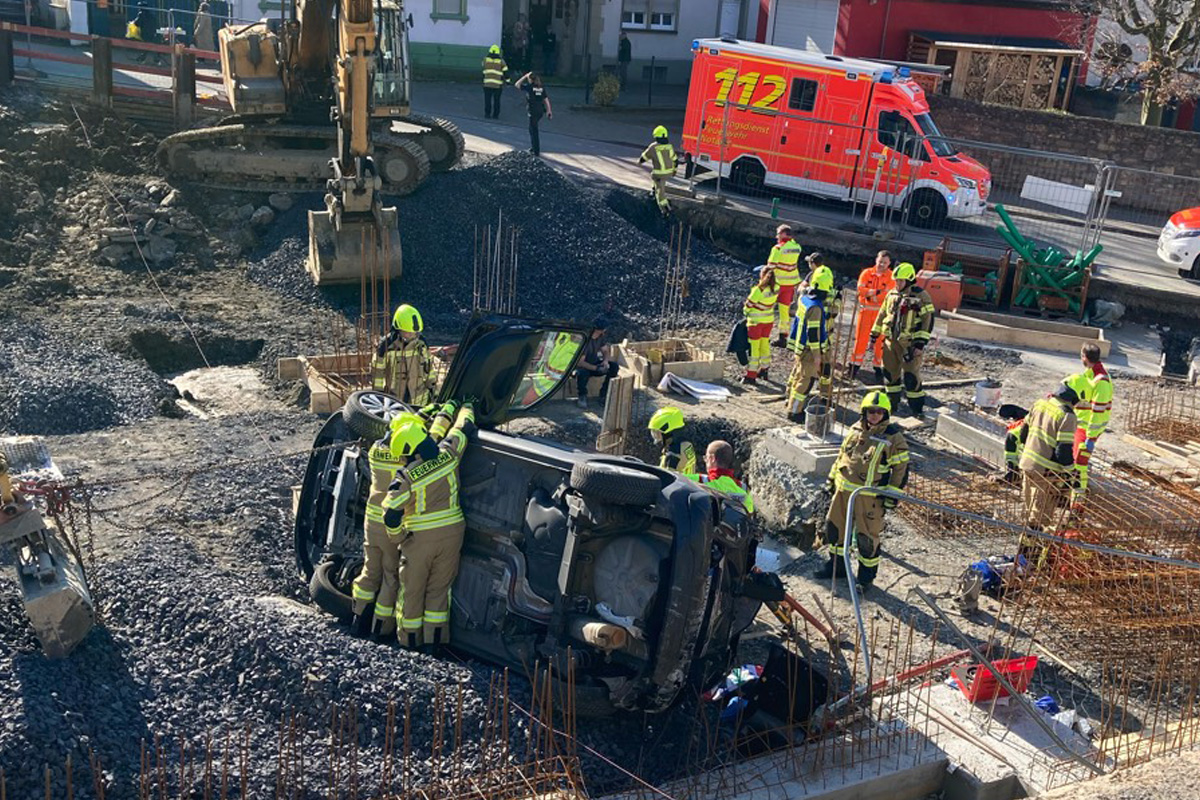 Hinter dem Bauzaun befand sich ein etwa drei Meter tiefer Abhang, den das Fahrzeug rückwärts hinabstürzte. Der Pkw kam anschließend auf der Seite zum Liegen.