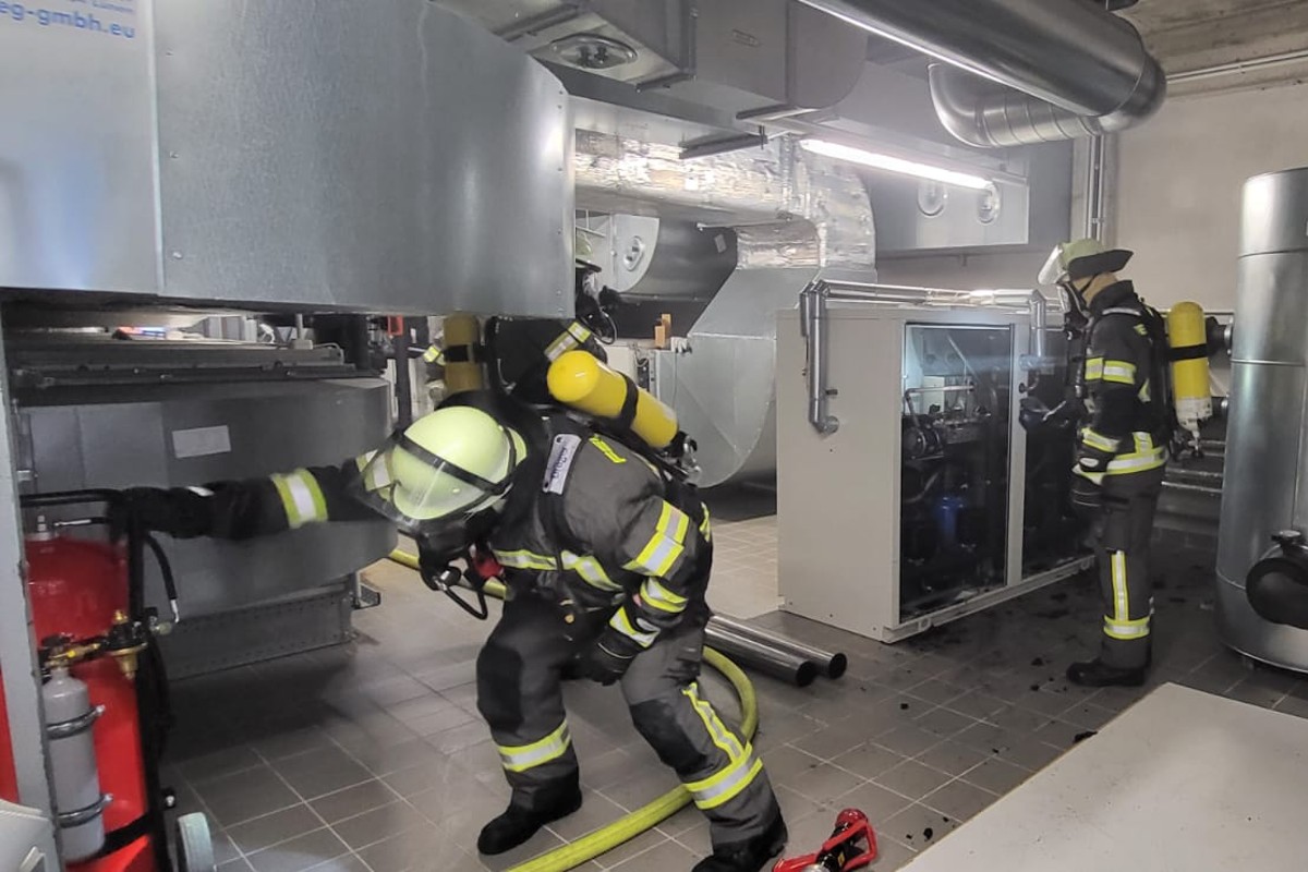 Aufwändig wurde die Verkleidung eines motorbetriebenen Lüfters entfernt um an die qualmelde Isolierung zu kommen. Vermutlich Aufgrund eines technischen Defektes ist ein Lüfter heiß gelaufen und dieses hatte die Isolierung in Brand gesetzt. Um keinen Gebäudeschaden durch Wasser zu verursachen, wurde im Lüftungsraum bzw. die mittlerweile ausgeschaltete Lüftungsanlage mit CO2 Löschern abgelöscht und gekühlt. Das Brandgut bzw. die qualmende Isolierung wurde zum Ablöschen ins Freie gebracht.