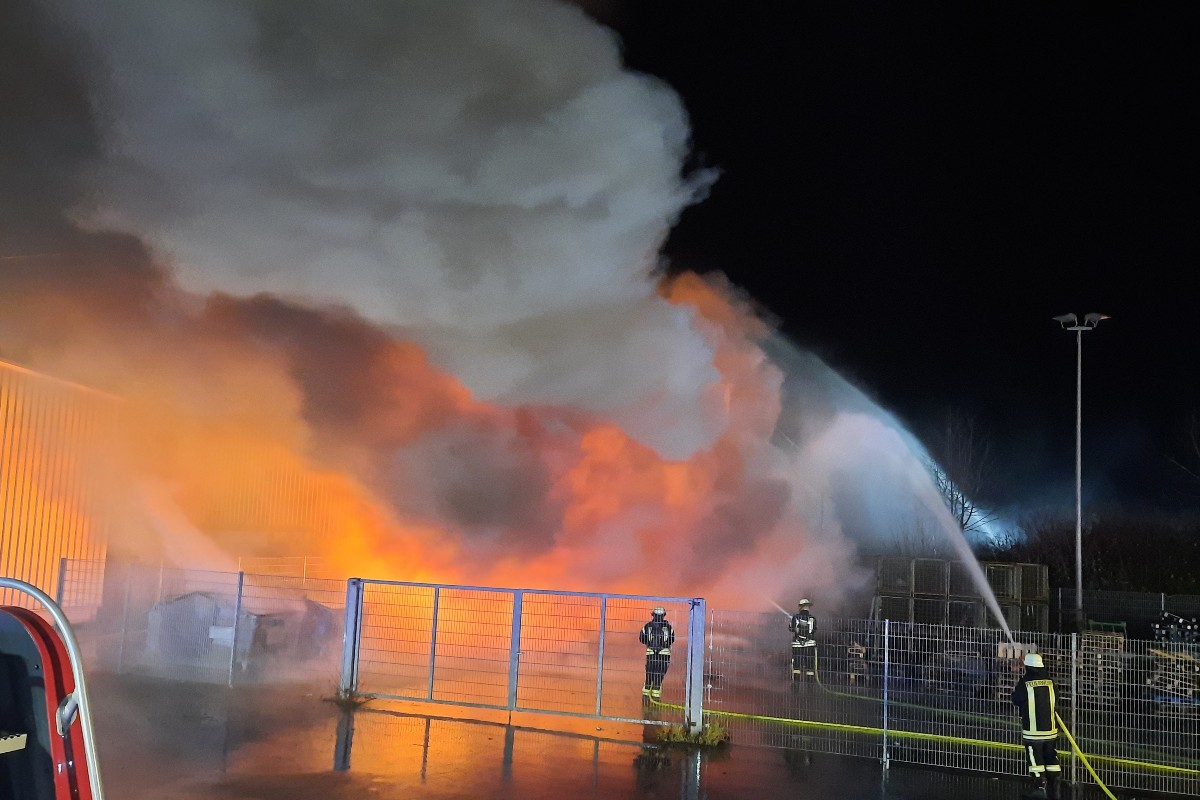 Das Feuer drohte darauf überzugreifen. Durch die Hitze und die Flammen wurden die Oberlichter einer Halle zerstört. Erste Trupps unter Atemschutz der Freiwilligen Feuerwehr Bergkamen bekämpften bereits beim Eintreffen der Drehleiter von außen die Flammen. Nach kurzer Rücksprache mit dem Einsatzleiter wurde die Drehleiter aus Werne in Stellung gebracht und von einem Löschfahrzeug aus Rünthe mit Wasser versorgt. Der automatisch gesteuerte Wasserwerfer mit einer Leistung von 1600 Liter pro Minute wurde am Korb montiert und bekämpfte kurz darauf die Flammen von oben.