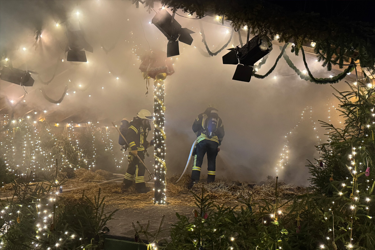Bei Eintreffen der ersten Einsatzkräfte brannte das auf dem Bühnenboden aufgebrachte Stroh. Umgehend wurde ein Angriffstrupp mit einem Strahlrohr zur Brandbekämpfung eingesetzt.
