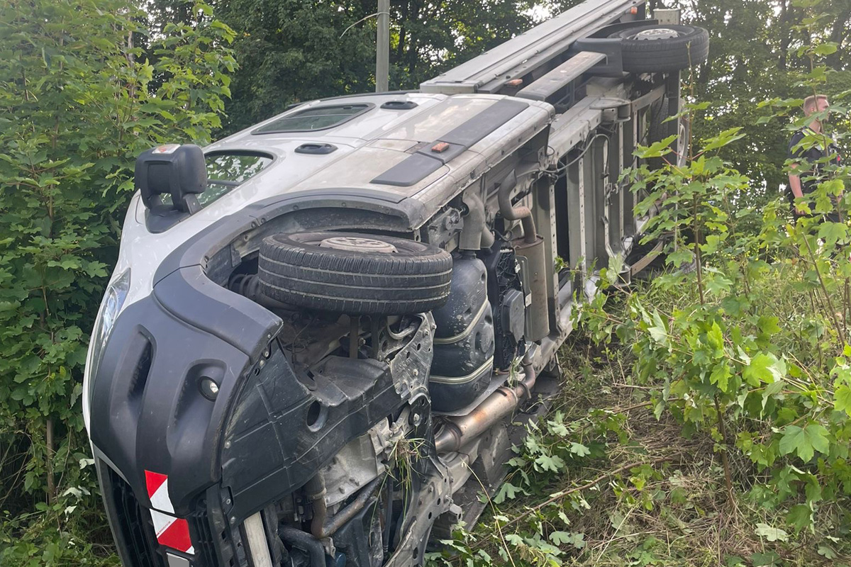 Dort war aus unbekannter Ursache ein Transporter von der Fahrbahn abgekommen und auf die Seite gekippt.