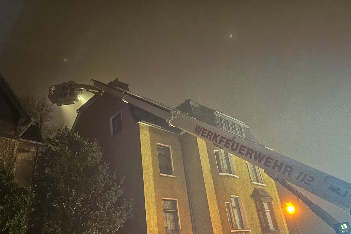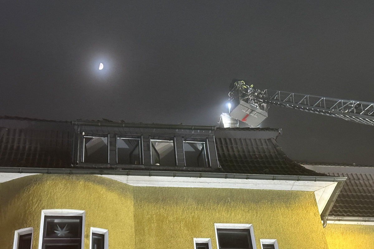 Da nicht alle Glutnester mit den Drehleitern erreichbar waren, kam in den Abendstunden zusätzlich eine Teleskopmastbühne der Werkfeuerwehr DEW aus Witten zum Einsatz.