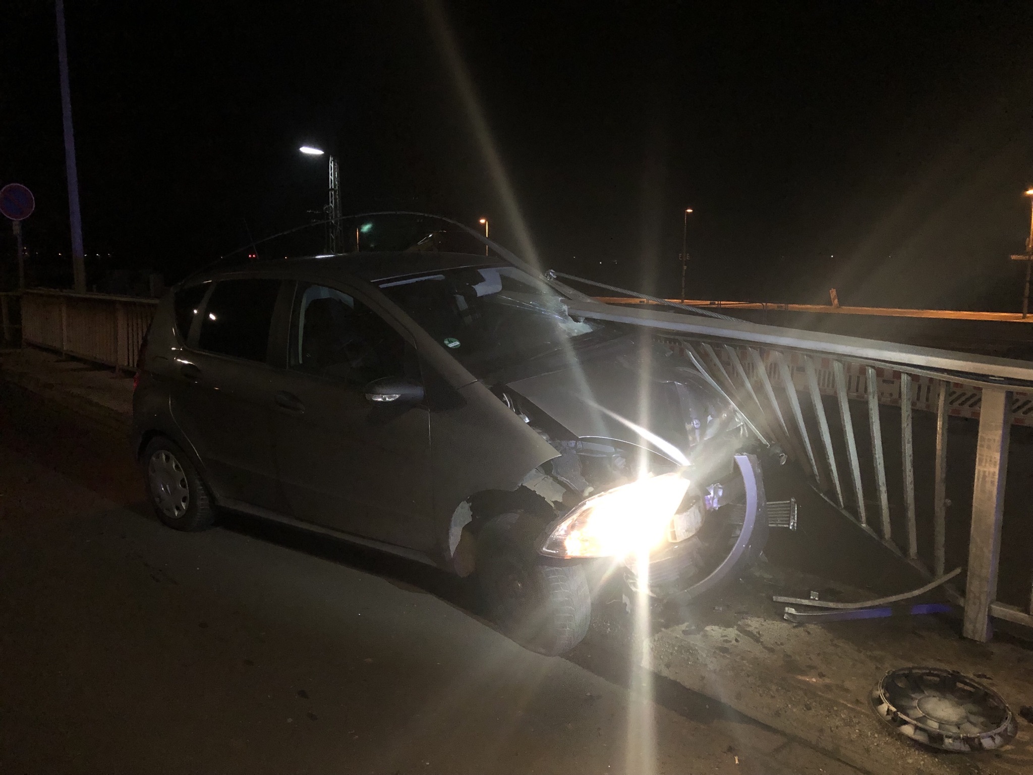 Er kam hierbei aus bislang noch ungeklärter Ursache in einer Rechtskurve nach links von der Fahrbahn ab und durchbrach dabei ein seitlich neben der Fahrbahn montiertes Geländer. Durch den Zusammenstoß wurde das Geländer derart beschädigt, dass sich dessen Handlauf durch die Windschutzscheibe des Fahrzeugs in den Innenraum bohrte.