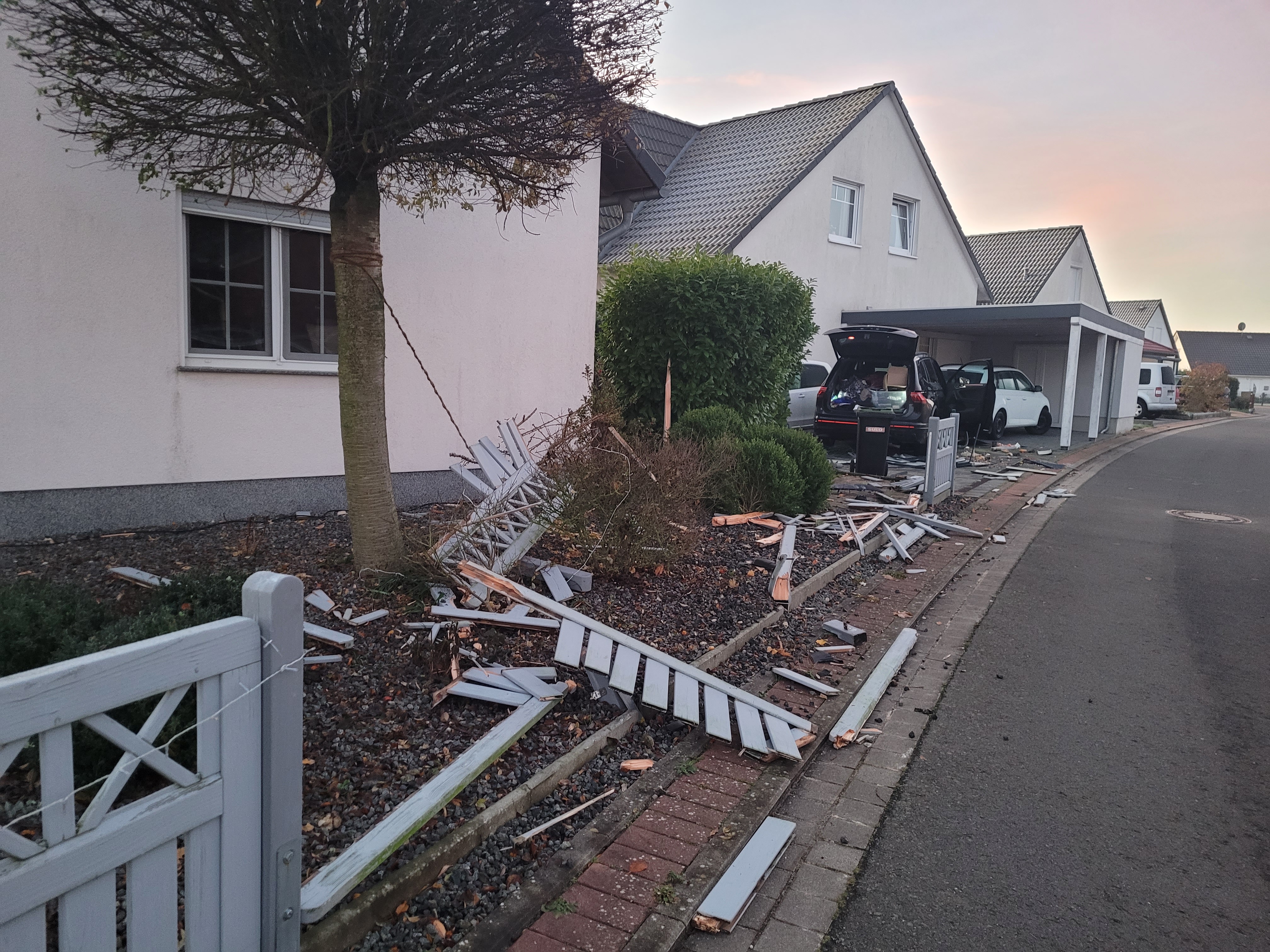 Der Fahrer eines gerade einmal einen Monat alten VW Tiguan kam mit seinem Fahrzeug nach links von der Fahrbahn ab, durchbrach einen hölzernen Vorgartenzaun und rammte mehrere Mülltonnen. Im Weiteren schob er mit seinem Fahrzeug einen in der Einfahrt eines Einfamilienhauses geparkten Pkw gegen eine angrenzende Hauswand. Der dabei verursachte Schaden wird polizeilicherseits bislang auf zirka 50.000EUR geschätzt.
