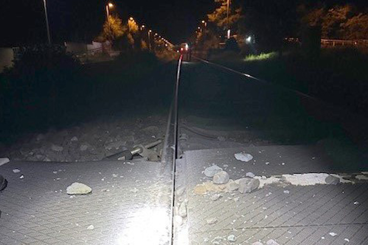 Weitere aufgereihte Steine lagen rund 20 Meter vor dem Triebfahrzeug. Diese wurden durch die Polizei beseitigt.