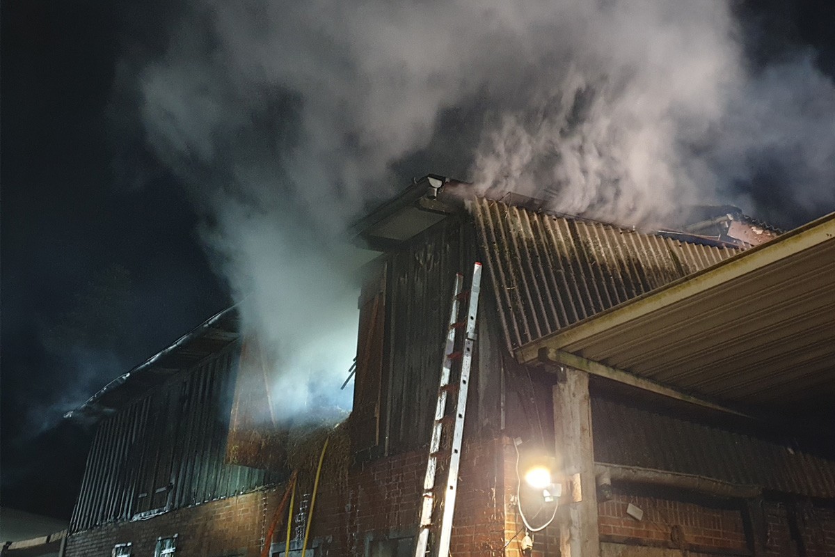In der Nacht zu Sonntag, 22.02.2026, ist in einem landwirtschaftlichen Gebäude in Jahrsdorf (SH) ein Feuer auf einem Heuboden ausgebrochen. Zwei Anwohner erlitten bei ersten Löschversuchen Rauchgasverletzungen. Rund 100 Einsatzkräfte waren bis in die Nachtstunden im Einsatz.