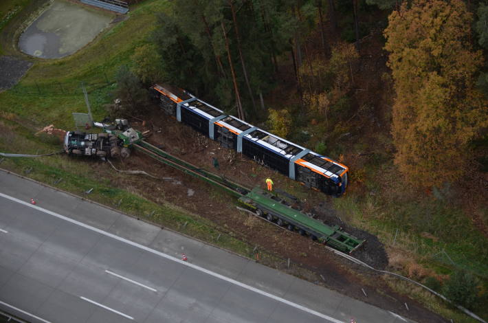 A9 Triptis – Schwerlasttransporter mit Straßenbahn verunglückt Ein Schwerlasttransporter (SLT) rutschte samt geladener Straßenbahn eine 10m tiefe Böschung neben der Autobahn herunter. 22.11.2022 | 18:15