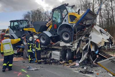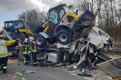 Bei einem Auffahrunfall am Stauende fuhren drei Sattelzüge auf der A 3 aufeinander. Das Führerhaus eines LKW wurde stark deformiert.