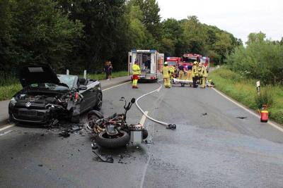 Bei einem Zusammenstoß mit einem PKW hat sich am Samstagabend (7. August) ein Motorradfahrer in Hückeswagen-Westenbrücke schwere Verletzungen zugezogen.