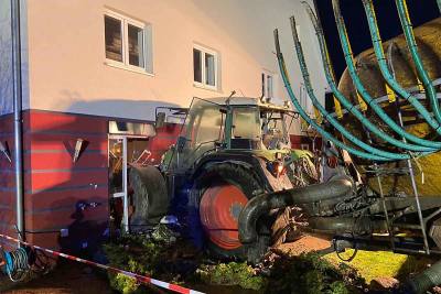 In Hüttenreute bei Hoßkirch (Lkr. Ravensburg) ist am Donnerstagabend ein Traktor in ein Wohnhaus gefahren.