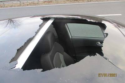 Gestern Mittag kam es auf der L1044 zu einem Unfall, bei dem ein Fahrzeug durch von einem Lkw herabfallendes Eis beschädigt wurde.