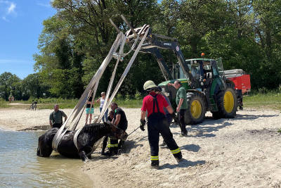 Heute Mittag wurden Einsatzkräfte der Löschgruppe Asperden zu einer Tierrettung an einem ehemaligen Baggersee an der Maasstraße gerufen. Hier hatte ein Reiter sein Pferd am Ufer trinken lassen.