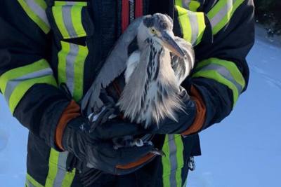Ein in einem Garten befindlicher Fischreiher hatte kalte Füße bekommen.