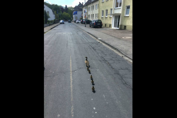 Entenfamilie gerettet Am Freitagmittag brachte eine Entenmutter mit ihren 6 frisch geschlüpften Küken den Verkehr auf der Engerser Landstrasse in Bendorf kurzweilig zum erliegen. 11.05.2019 | 14:46