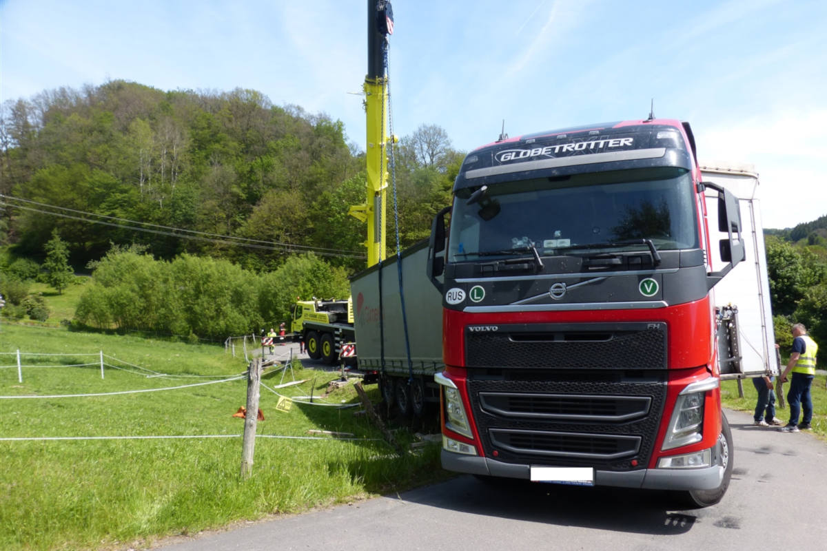 Das Bergeunternehmen war in die Straße Hofwiese nach Bergneustadt-Immicke gerufen worden. Ein ausländischer Sattelschlepper hatte sich in die kleine Nebenstraße verfahren, wobei der Auflieger auf ein unbefestigtes Wiesengelände geraten war und umzustürzen drohte.