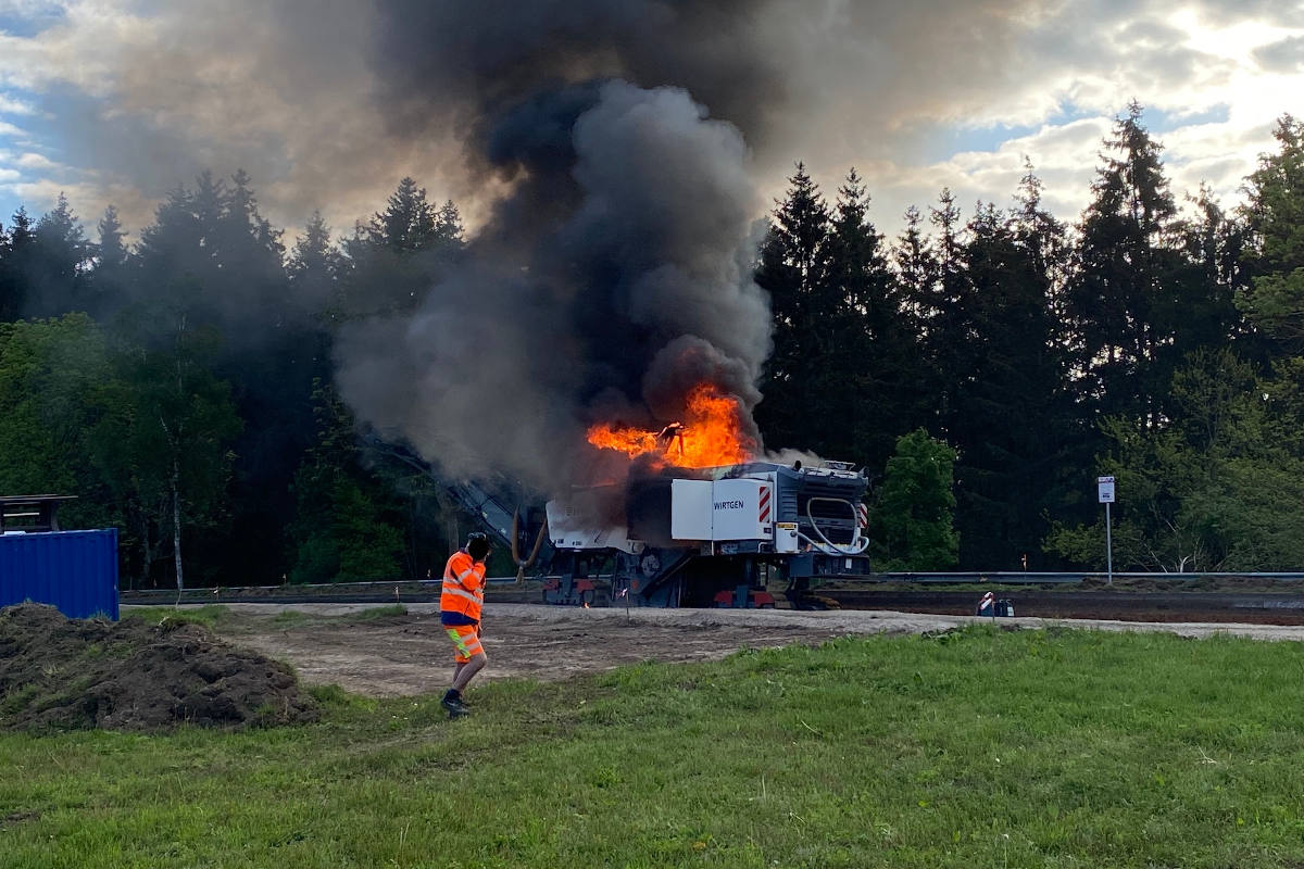 Am Donnerstag, dem 12.05.2022 gegen 07:30 Uhr kam es auf der A1, Rastplatz Steiner Wald zu einem Brand einer Baumaschine. Während Arbeiten mit einer Baufräse kam es zu einem technischen Defekt. Die Baufräse geriet daraufhin in Vollbrand und brannte vollständig aus.