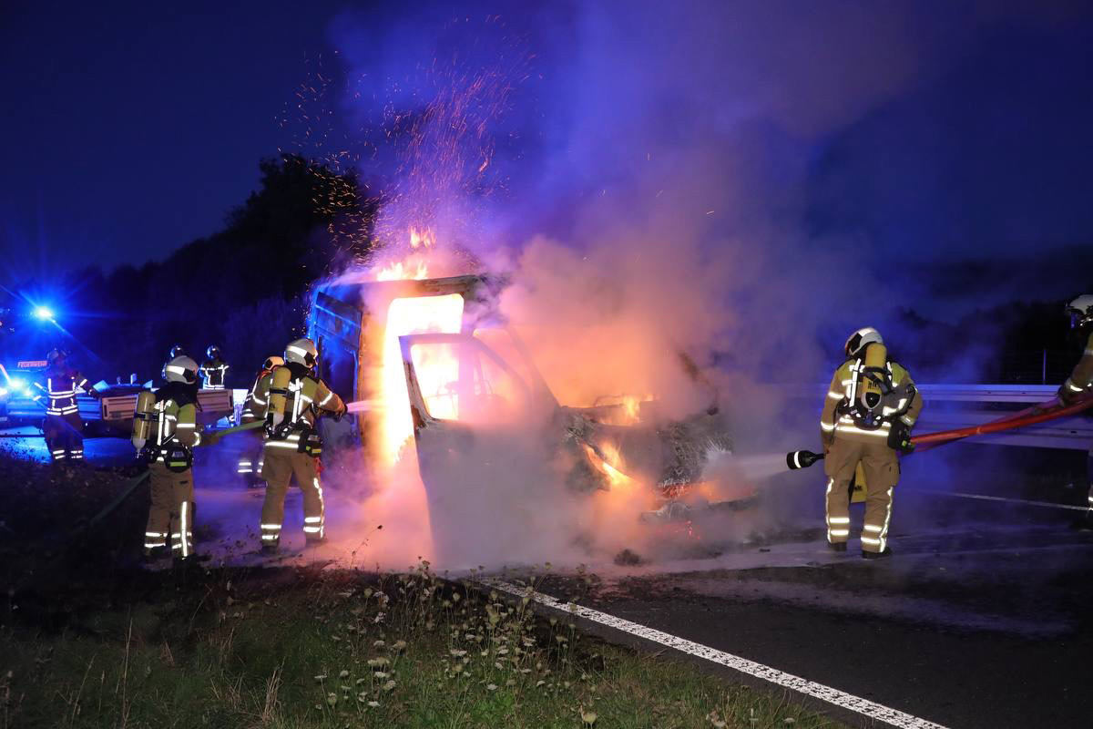 Vor Ort stand ein Mercedes-Benz Sprinter in Vollbrand. Das Feuer hatte bereits Teile der umliegenden Vegetation erfasst.