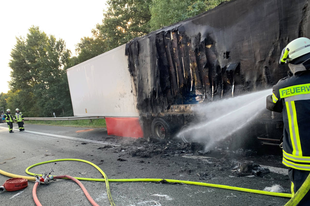 Lkw-Auflieger mit 20 Tonnen Fleisch geht auf der A2 in Flammen auf