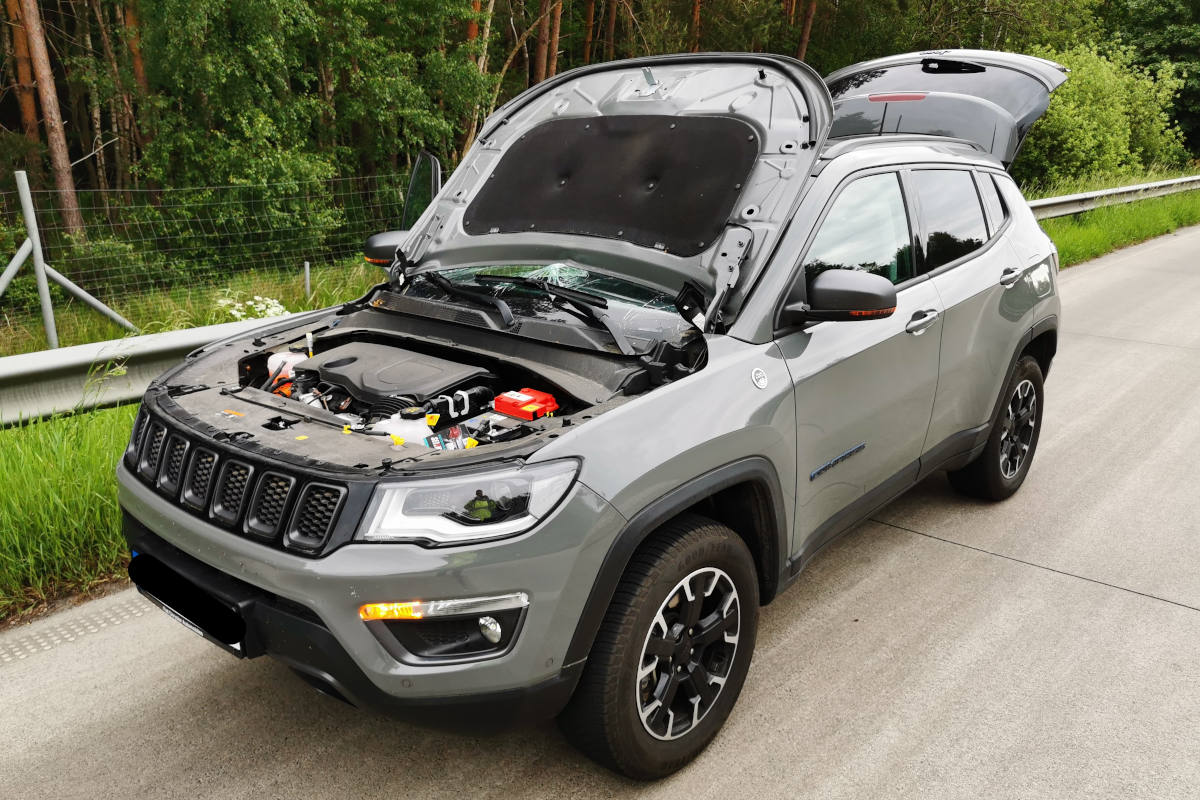 Der Pkw Jeep wurde regelkonform mit ca. 150 km/h auf dem Überholfahrstreifen geführt, als unvermittelt die Verriegelung der Motorhaube brach. Dadurch schlug die Motorhaube nach hinten und prallte auf die Windschutzscheibe, welche erheblich beschädigt wurde. Der guten Reaktion des 37-jährigen Fahrzeugführers ist es zu verdanken, dass es nicht zu weiteren Beschädigungen oder Folgeunfällen kam. Er konnte das Fahrzeug auf dem Standstreifen sicher stoppen.