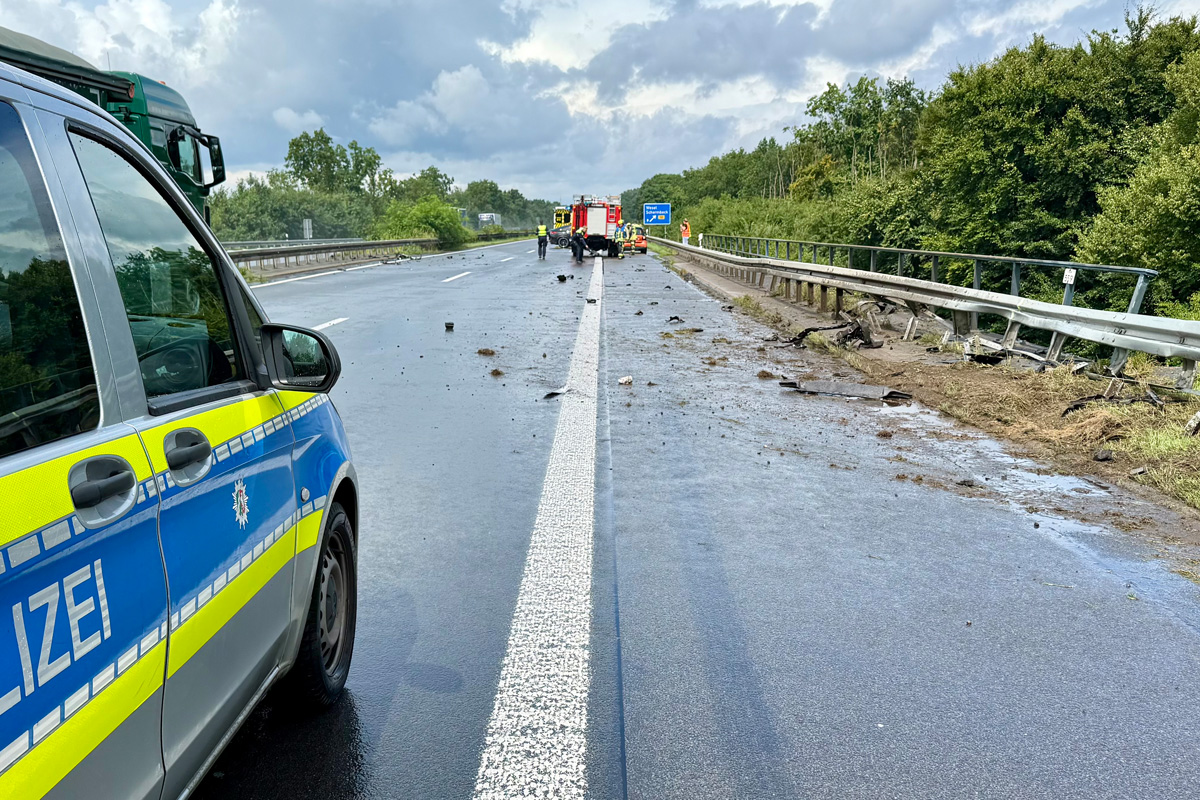 Auf der A3 bei Hünxe prallte am Freitag, 1. August 2025, ein Pkw gegen die Leitplanke und kam quer zur Fahrtrichtung zum Stehen. Die Fahrerin konnte sich selbst befreien und blieb unverletzt.