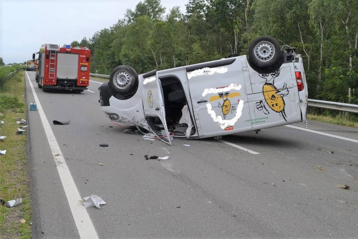 Von dort wurde er zurück auf die Fahrbahn geschleudert, wo er sich mehrfach überschlug und auf dem Dach zum Liegen kam. Beide Fzg-Führer wurden schwer verletzt, es entstand ein Sachschaden von ca. 80.000 Euro. Die Autobahn musste für Bergungs-und Reinigungsarbeiten mehrfach kurzfristig voll gesperrt werden. Die örtlichen Feuerwehren waren mit starken Kräften im Einsatz. (Bilder an der Pressemitteilung)