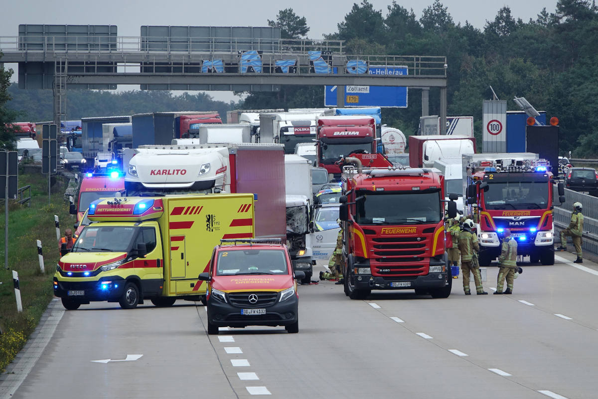 Bei einem Verkehrsunfall zweier LKW zwischen den Anschlussstellen Hellerau und Wilder Mann wurde der Fahrer des auffahrenden LKW im Fahrerhaus zwischen Sitz und Lenksäule mit dem rechten Bein eingeklemmt und konnte sich nicht selbst befreien.