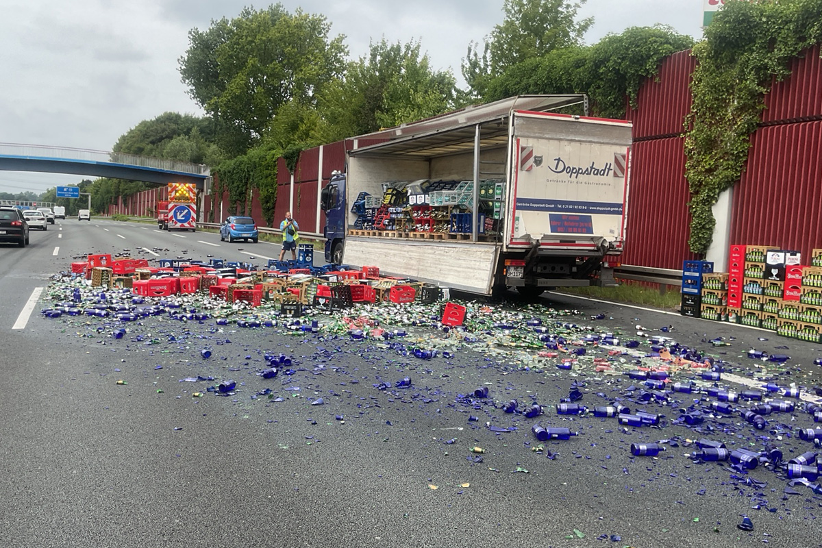 Am Montagmittag, 4. August 2025, verlor ein Lkw bei Bochum auf der A40 zahlreiche Getränkekisten. Die Strecke in Richtung Essen musste vorübergehend gesperrt werden.