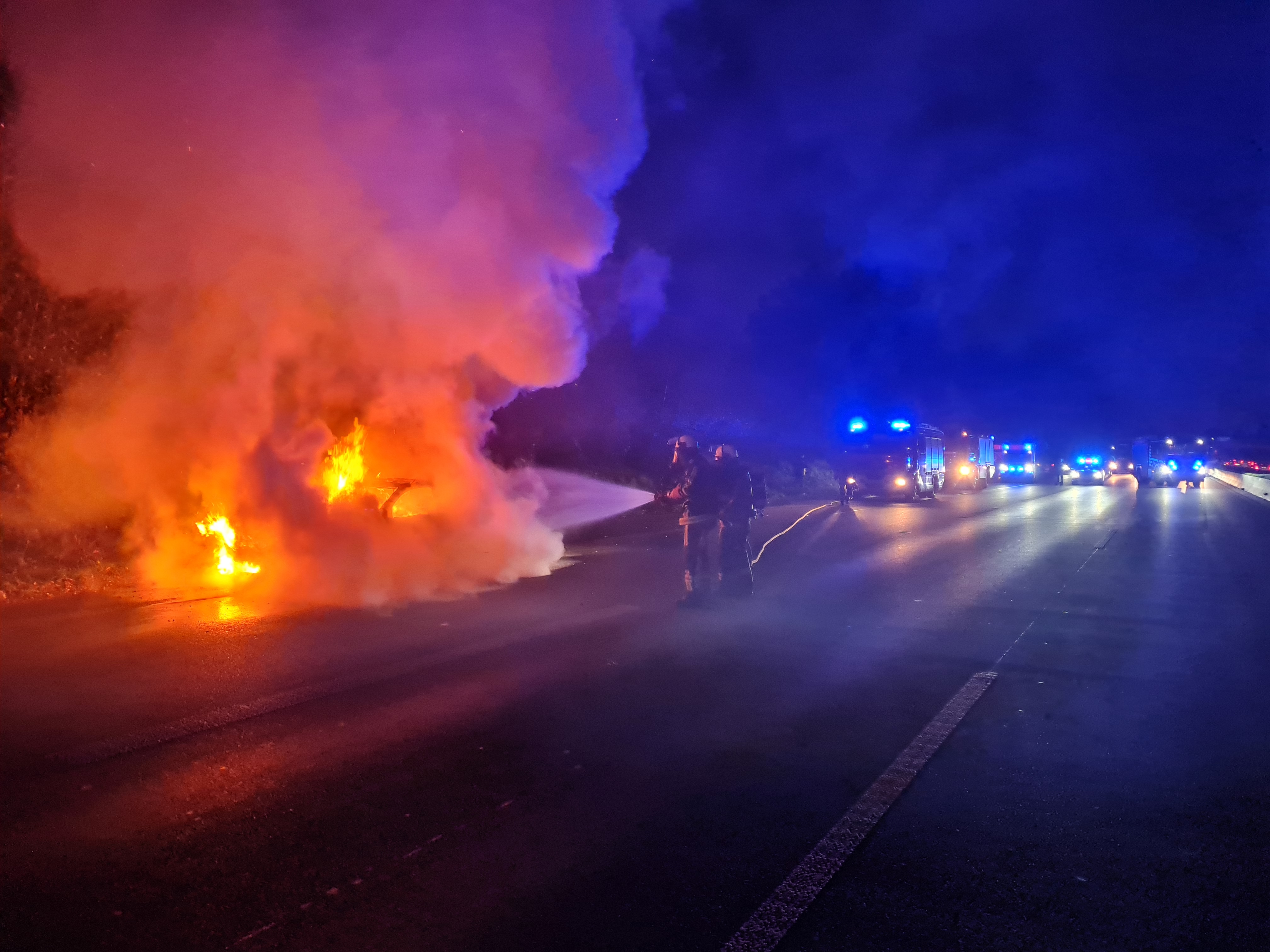 Der PKW stand bei Eintreffen der Einsatzkräfte bereits in Vollbrand. Der leichtverletzte Fahrer wurde zunächst vom Rettungsdienst medizinisch versorgt und dann in ein Bochumer Krankenhaus gebracht. Die Löscharbeiten unter schwerem Atemschutz zunächst mit Wasser, dann mit Löschschaum zeigten schnell Wirkung, so dass nach gut 45 Minuten die Einsatzstelle an die Autobahnpolizei übergeben werden konnte. Während der Löscharbeiten musste die Autobahn aus Sicherheitsgründen kurzzeitig voll gesperrt werden.