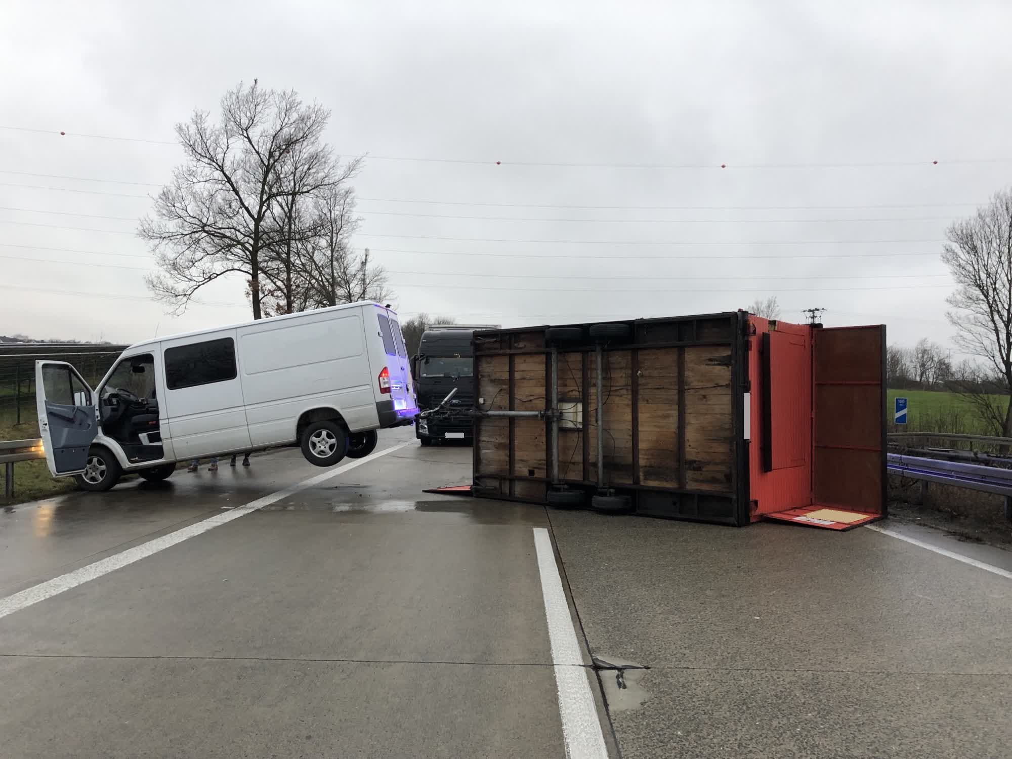 Der 50 jährige Fahrer eines Mercedes Sprinters aus dem Kreis Göttingen fuhr an der Anschlussstelle Geseke in Richtung Kassel auf die A44 auf. Als Anhänger zog er mit seinem Transporter eine mobile Pommesbude. Aufgrund starker Seitenwinde, geriet das Gespann bei noch geringer Geschwindigkeit außer Kontrolle. Der Anhänger kippte auf die rechte Seite und blockierte den linken Fahrstreifen. Der Transporter stellte sich daraufhin auf dem rechten Fahrstreifen und dem Seitenstreifen quer und die Hinterachse hing in der Luft, so dass die Fahrbahn komplett blockiert wurde.