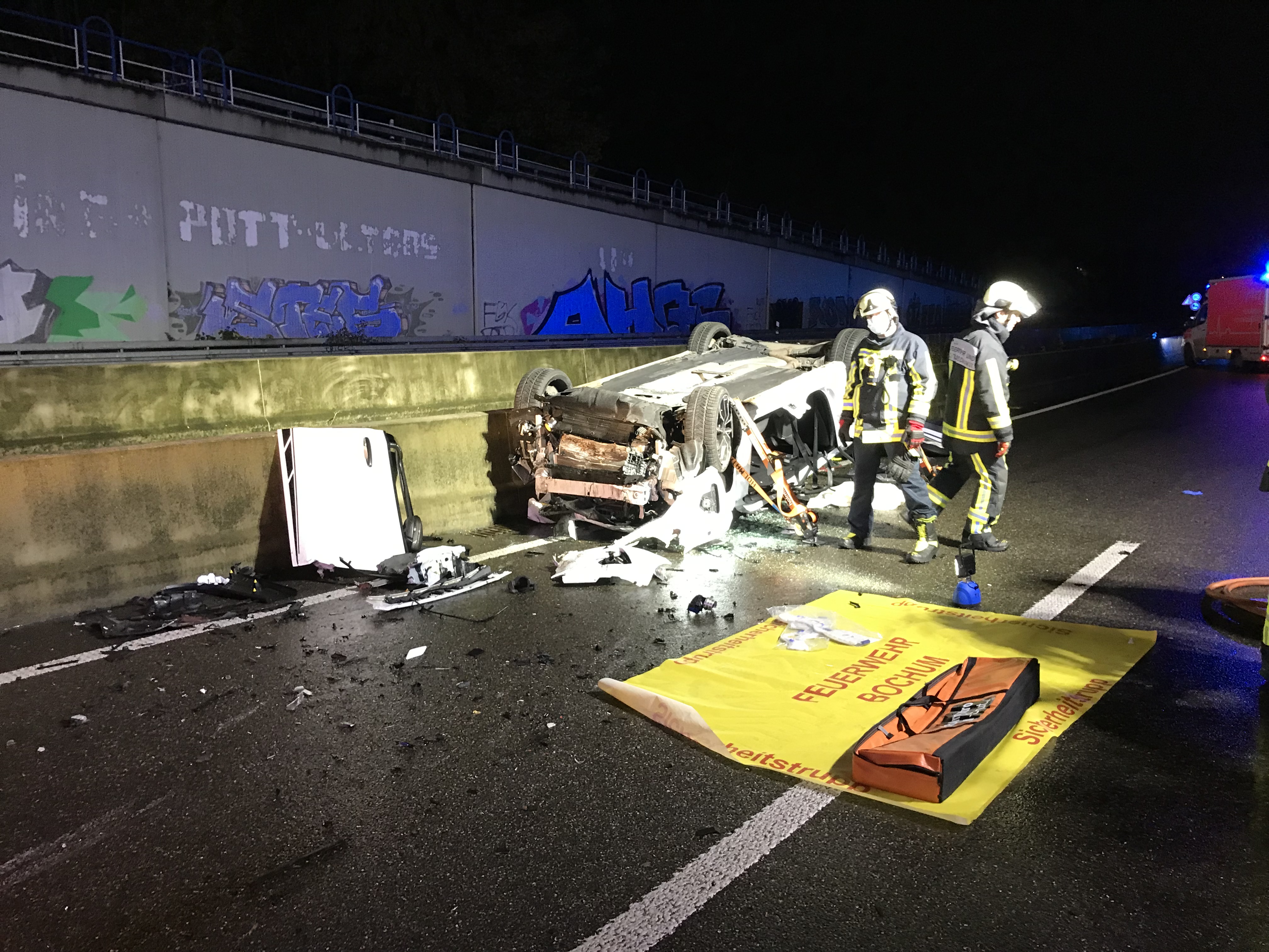 A448 Bochum – PKW mit 4 Insassen stürzt von Brücke auf die Autobahn
