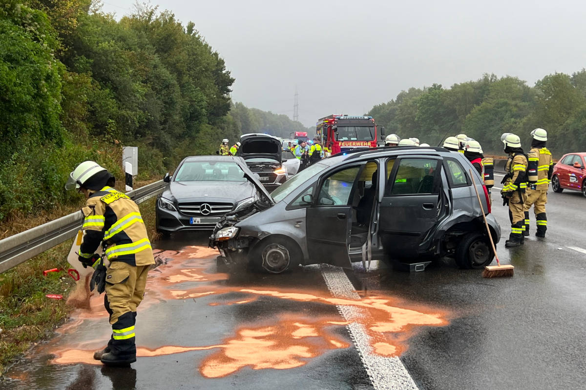 Die Feuerwehr Haan wurde um 9.38 Uhr alarmiert, nachdem vier Fahrzeuge in Fahrtrichtung Düsseldorf zwischen den Anschlussstellen Haan-Ost und Haan-West auf regennasser Fahrbahn kollidiert waren. Einsatzkräfte versorgten die Verletzten. Insgesamt wurden sieben Rettungswagen, zwei Notarzteinsatzfahrzeuge, der Leitende Notarzt des Kreises Mettmann sowie der Organisatorische Leiter Rettungsdienst der Feuerwehr Ratingen angefordert. Acht Patienten wurden nach Erstversorgung in umliegende Krankenhäuser transportiert, ein Verletzter wollte selbständig einen Arzt aufsuchen. Die Feuerwehr Haan war mit neun Fahrzeugen im Einsatz.