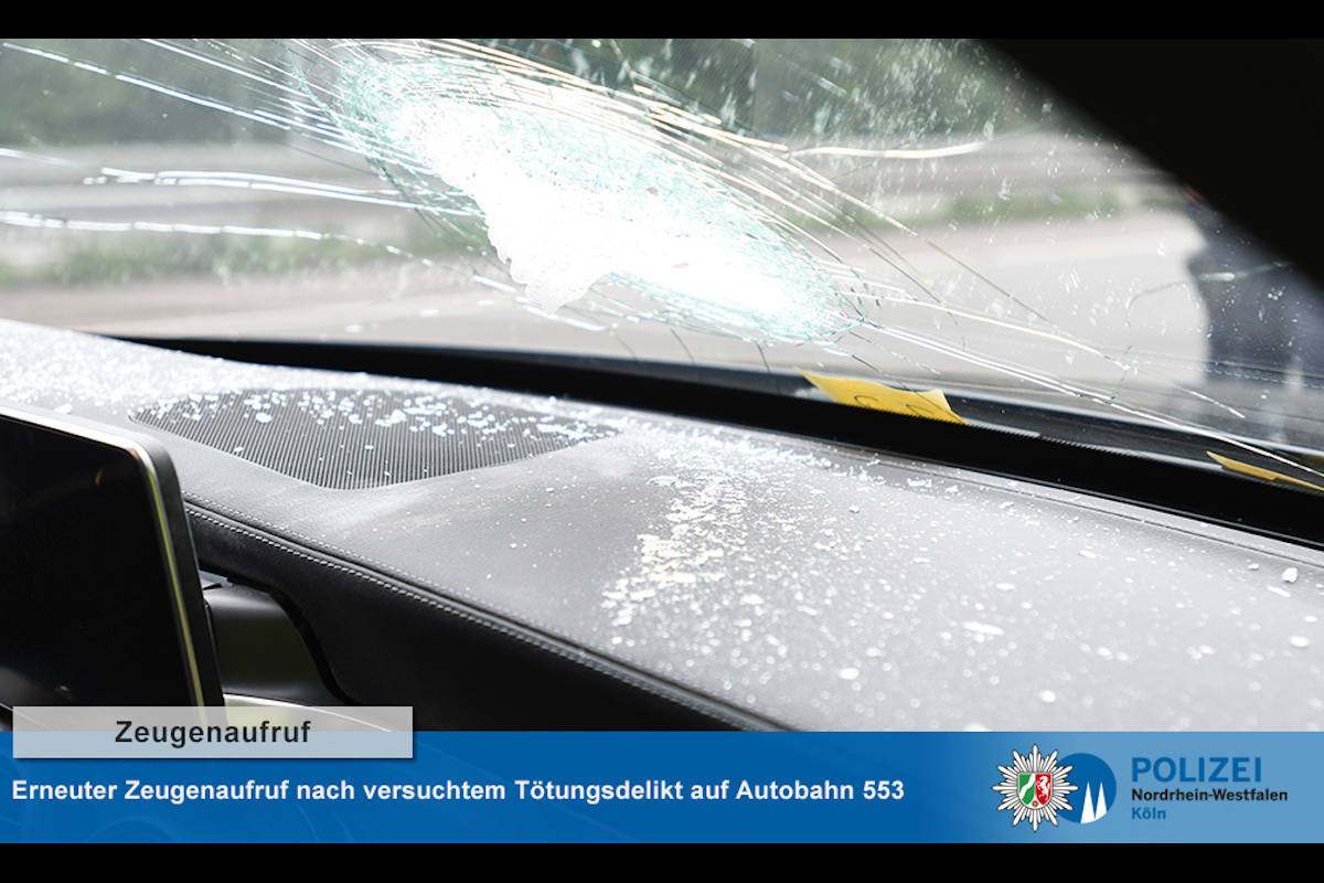Nach dem versuchten Tötungsdelikt durch das Werfen eines faustgroßen Steins von der Phantasialandstraße auf die Autobahn 553 am Freitagnachmittag (9. Juli) ist die 57-jährige Beifahrerin der Mercedes C-Klasse zwischenzeitlich aus dem Krankenhaus entlassen worden.